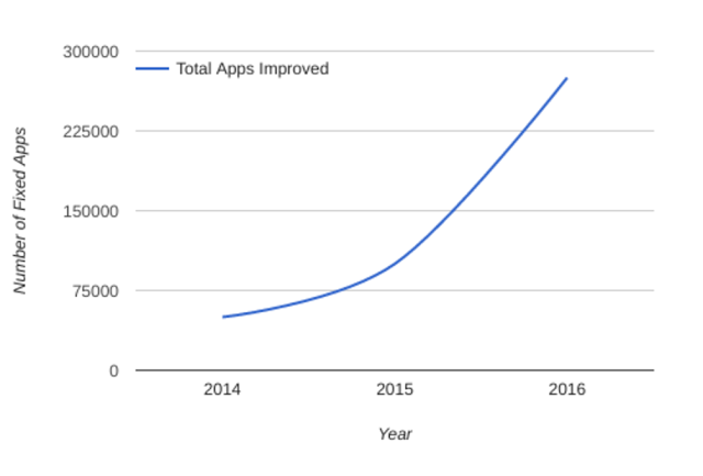 В 2015 году Google добавила проверку программ на 6 уязвимостей, в 2016 еще 17. При этом 12 из них имеют срок устранения. В апреле 2016 года программа ASI атрагивала 100000 приложений, а до сегодняшнего дня их количество выросло почти втрое — до 275 тыс.