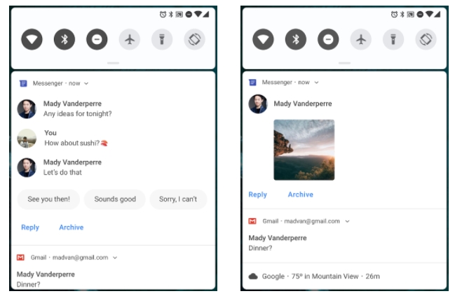 Тем не менее, Android P принесла адаптацию экранов с вырезом, как у iPhone X. В ней улучшена шторка с уведомлениями. Теперь там могут отображаться даже картинки, если они имеются в принятом сообщении. Также прямо из шторки можно создать черновик ответа на сообщение.