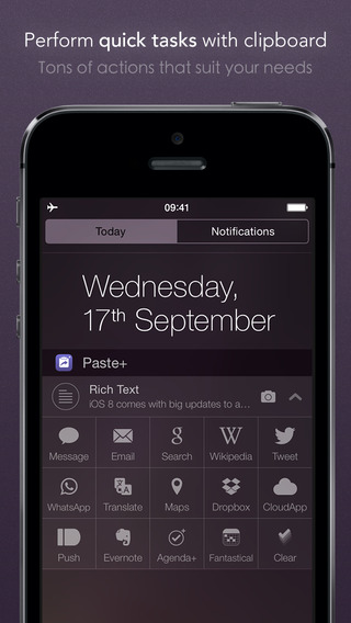 Это мощный виджет для работы с буфером обмена в iOS 8. Скопированный текст можно быстро перенести в Evernote, добавить в качестве задания в Clear, отправить по почте, через iMessage или сохранить в Dropbox. Самое дорогое приложение в нашем топе – 129 руб.
