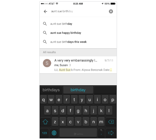 В приложении используется новый подход к поиску писем. Любой запрос можно ввести естественным языком, например «сотовый телефон Тима», и специально настроенный поиск покажет вам 7-значный номер, связанный с именем Тим (даже если в электронном письме нет слова «телефон»).
