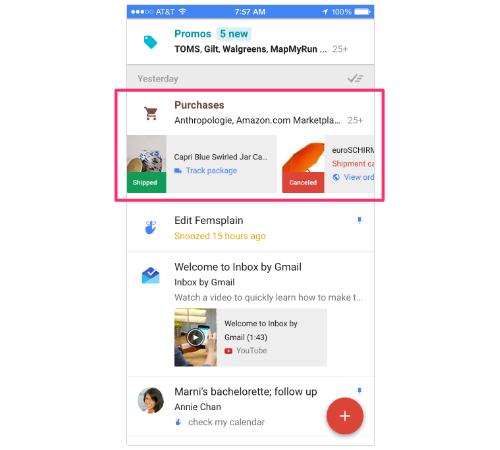 Эти категории особенно выручают, когда Inbox анализирует содержание письма и показывает важную информацию из него. Например, под коричневой иконкой тележки собраны письма о покупках, при этом тут же выводятся картинки этих покупок и статус доставки. Теперь мне не нужно открывать скучные автоматизированные письма, чтобы узнать, что купленная в Anthropologie свечка уже выслана, а заказанный в Amazon зонт отсутствует на складе. (Я в курсе, что подобное автоматизированное цифровое подглядывание причиняет беспокойство людям, помешенным на конфиденциальности. Если вы к ним относитесь, просто не используйте данное приложение.)