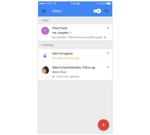 И вот здесь приложение начинает несколько озадачивать. Например, мне пока неясно, какие сообщения нужно прикреплять во входящих, а какие – смахивать направо, чтобы убрать в «сделанные». Я понимаю, что Google хочет решить проблему 7000 непрочитанных писем во входящих с красной иконкой, но я недостаточно себе доверяю, чтобы точно знать, что нужно прикреплять, а что – смахивать. У меня постоянно всплывают какие-то старые планы и обсуждения, и нужно изрядно подумать, чтобы определиться, какие из них достаточно важны, чтобы их оставлять. Может быть, поэтому мне никогда не увидеть почты без непрочитанных писем. А может быть, раз я еще не сошла с ума, это не так уж и плохо.