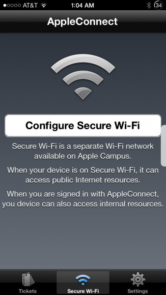 Клиент для доступа к корпоративной беспроводной сети Wi-Fi в штаб-квартире Apple. Что интересно, вместо пароля в AppleConnect используются свайп-жесты в стиле Android. Есть и обычная парольная блокировка.