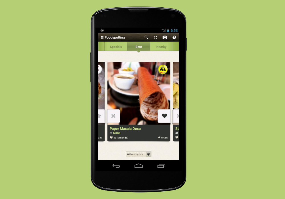 Это социальное приложение помогает найти ближайший ресторан с едой, которую хочется прямо сейчас: например, тайский суп том ям в Нью-Йорке или пиццу в Лондоне. Приложение работает по принципу Foursquare, только специализируется на поиске пищи: отзывы, фотографии и комментарии оставляют активные пользователи программы. Foodspotting указывает точный адрес ресторана и расстояние до него, сообщает информацию о ценах и качестве приготовления выбранных блюд, а также о скидках и акциях, проводимых в найденных заведениях.