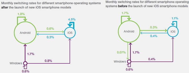 Ежемесячно 1,7% пользователей меняют свой смартфон с Android на новую модель с этой ОС, а 0,3% переходит в лагерь iOS. Одновременно 1,1% владельцев iPhone меняют его на новую модель с iOS, а 0,4% — переходят на смартфоны с ОС Android. На некоторых зрелых рынках 60% владельцев новой модели iPhone перешли на нее с предыдущей модели, которая вышла всего год назад.