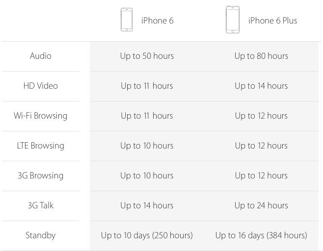 Аккумулятор iPhone 6 будет способен обеспечить 24 часа в режиме 3G разговора, до 14 часов в режиме просмотра видео, до 80 часов в режиме прослушивания музыки, до 12 часов в режиме серфинга интернета при Wi-Fi и до 16 дней (384 часа) в режиме ожидания.