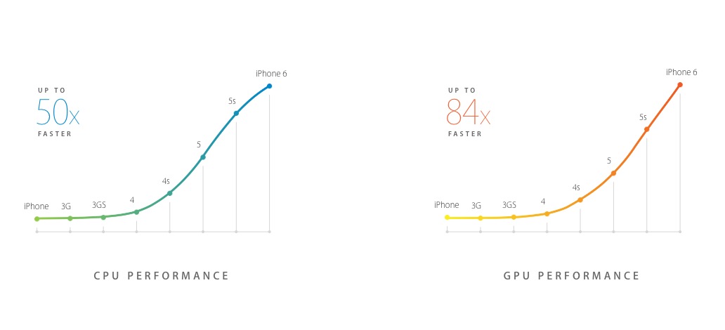 Чип в 84 раза производительнее того, которым оснащался первый iPhone. Благодаря 3D-движку Metal, представленному Apple несколькими месяцами ранее, производительность в играх, дебютировавших на презентации, заслуживает высших похвал. Сопроцессор M8 стал умнее: теперь он умеет не только считать шаги, но и высчитывать высоту.
