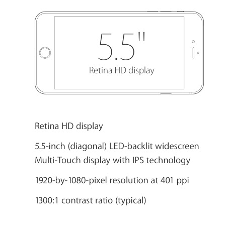 Смартфон имеет 5,5-дюймовый IPS ЖК-дисплей с разрешением Retina HD (1920 х 1080 пикселей или другими словами 1080p). Плотность пикселей составляет 400 точек на дюйм, а iOS 8 была улучшена, чтобы в полной мере воспользоваться более крупным дисплеем.