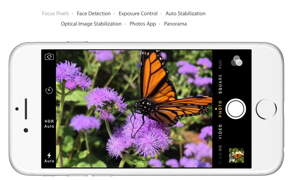 Apple сообщает, что камеру способна снимать панорамы до 43 МП. Режим Slo-mo при съемке видео работает с частотой 120 или 240 fps. Разрешение записи видео сохраняется в размере 1080p, но 60fps повышен до max FullHD (720p @ 60fps).