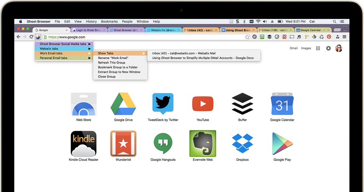 Ghost Browser позволяет выделить хранилища cookie в маркированные цветом вкладки. Благодаря этому на одни и те же сайты можно заходить под разными учетными записями. Это полезно для тех, кто тесно работает с онлайном: разработчикам, дизайнерам, SMM-щикам и тому подобное.