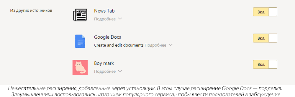 Довольно часто такие расширения распространяются вместе с полезными программами. Кроме того, такие плагины могут попасть в систему под видом безопасного дополнения. Но даже если загружать расширения только из официального магазина, нельзя гарантировать полную безопасность. Уже после установки безопасный модуль может загрузить из Сети дополнительный вредоносный код.