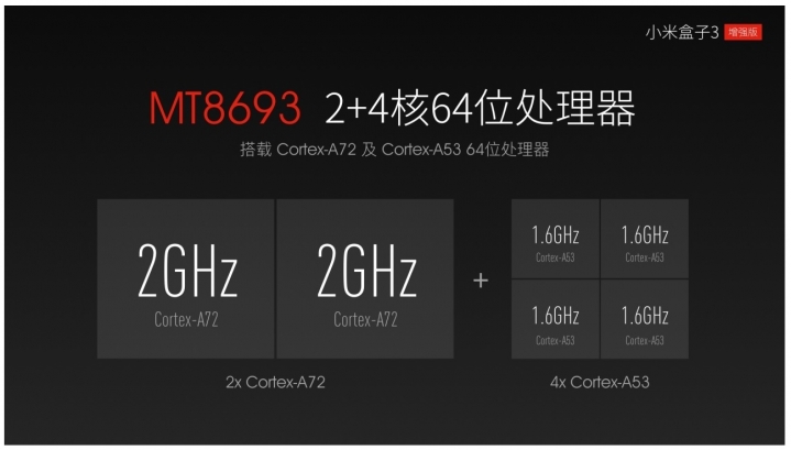 Самое большое изменение в устройстве, это более быстрый процессор. Mi Box 3 Enhanced Edition поставляется с 64-битным шестиядерным чипсетом MT8693 от MediaTek (2 х 2 ГГц Cortex-A72 + 4 х 1.6 ГГц Cortex-A53) и графикой PowerVR GPU GX6250.