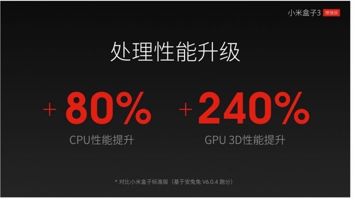 Производительность процессора, как заявляет компания, на 80% быстрее, а производительность графического процессора на 240% быстрее, чем стандартный Mi Box 3. Существует улучшенная система охлаждения с вентилятором для поддержания температуры на низком уровне.