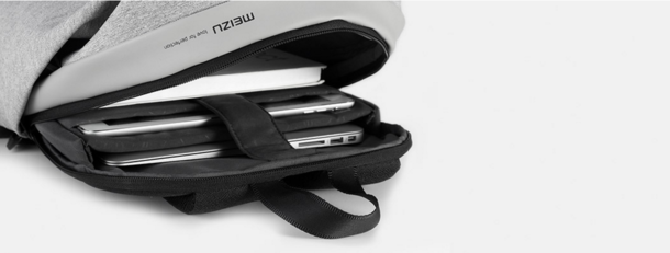 Рюкзак Meizu обладает девятью отсеками различного размера. Кроме всяких мелочей в него можно поместить и полноценный ноутбук.