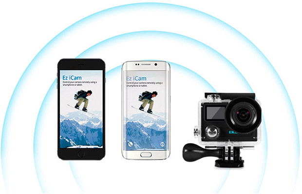 Камера EKEN H8 Pro синхронизируется с гаджетами по Wi-Fi, оснащена процессором Ambarella A12S75, поддержкой карт памяти до 64 ГБ, портами HDMI и Micro USB, возможностью записи видео 1080P (120fps),1080P(60fps),1440P (30fps),2.7K (30fps),4K (30fps),720P (1280 x 720).