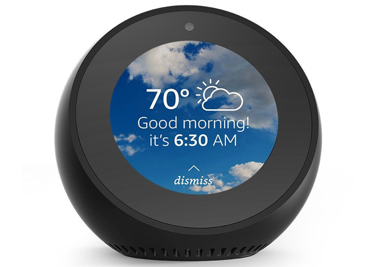 Echo Spot — это небольшой будильник с 2,5-дюймовым круговым дисплеем на передней панели, который работает почти так же, как дисплей на Echo Show. Он также получил Bluetooth модуль, камеры, динамик мощностью 2 Вт и массив из 4 микрофонов.