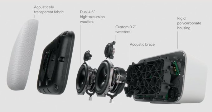 Google Home Max обладает парой 4.5-дюймовых динамиков для нижних частот и двумя 0.7-дюймовыми твиттерами. Предусмотрены специальные сенсоры для лучшей настройки звука для определенной комнаты.