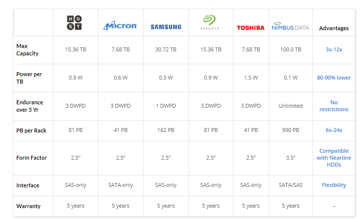 Самый большой в мире SSD диск упакован в привычный 3,5-дюймовый форм-фактор SATA. В центре внимания энергоэффективность (0,1 Вт / ТБ), эффективное пространство и долговечность, а не скорость. Компания Nimbus заявляет, что центры обработки данных могут сократить свои расходы на электроэнергию, охлаждение и пространство на 85% по сравнению с другими крупными SSD (например, SSD от Samsung на 30,72 ТБ). По оценкам Nimbus, общая стоимость (диск и все комплектующие) за 5-летний период будет меньше на 42% по сравнению с аналогами.