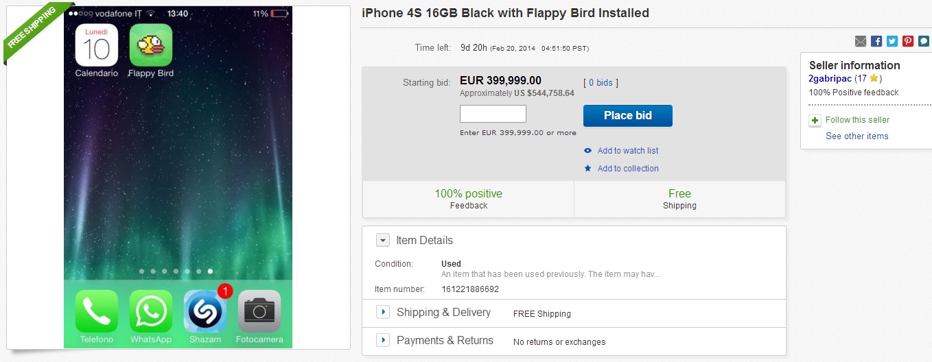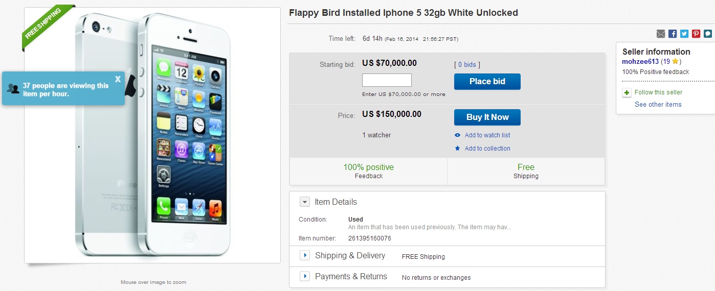 Издание PhoneArena провела сообщает, что нашли на eBay iPhone 5 на 16 Гб с предварительно установленной «Flappy Bird», который стоит ошеломляющие $99,000, аукцион начался с суммы в $750. Другой iPhone, расположенный в Италии, в настоящее время стоит немыслимые $163,428.