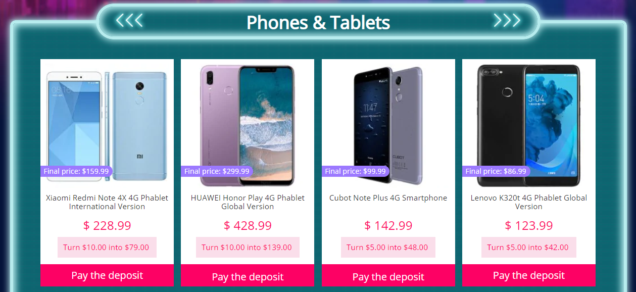 Если подробнее, то, к примеру, смартфон продается за $228.99, вы с 5 по 10 ноября оплачиваете депозит в районе $10.00, остальную стоимость оплачиваете с 10 по 15 ноября, при этом экономите $69.00 от первоначальной цены.