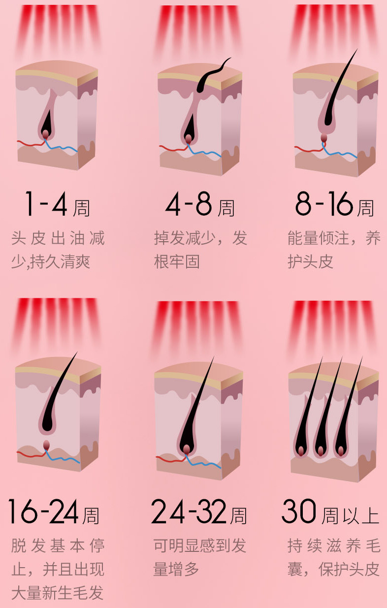 LLLT Laser Hair Comb воздействует на волосы пучками красного (650 нм) и синего (415 нм) света. Первый проникает в глубокие слои кожи головы, активируя рост волосяного фолликула, а также восстанавливая стареющие и «спящие» фолликулы. Это способствует улучшению состояния кожи головы и росту волос. Синий свет может контролировать выделение жира, очищает закупоренные поры и усиливает корни, уменьшая выпадение волос.