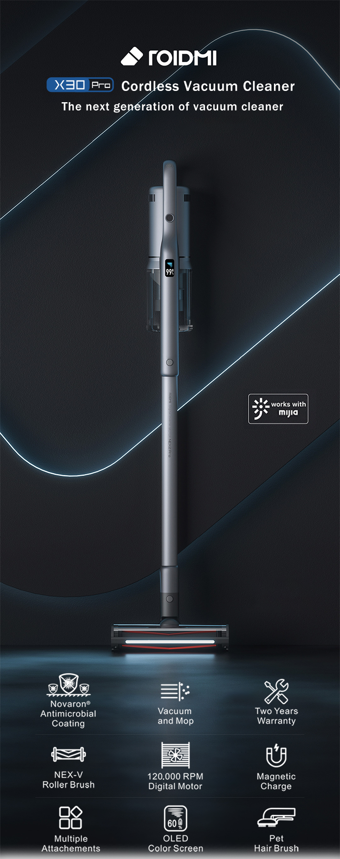 Roidmi X30 Pro предлагает внушительную мощность всасывания, обеспечиваемую двигателем со скоростью вращения ротора 120 000 об/мин. Новинка получила вращающуюся щеточную головку V-образной формы.