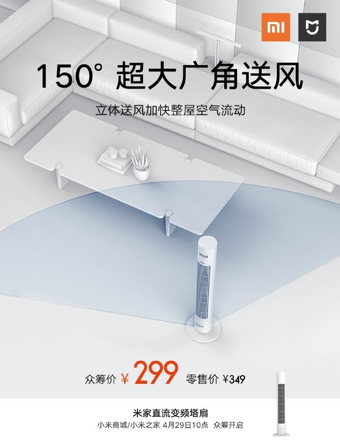 MIJIA DC Inverter Tower Fan использует бесщеточные вентиляторы постоянного тока с максимальной производительностью до 541 м³ / ч. Вентилятор имеет цилиндрическую конструкцию с круглым основанием, тонкий выпускной патрубок диаметром 6.9 мм, сверхбольшие выпускные отверстия для воздуха, обеспечивает сверхширокоугольную подачу воздуха под углом 150 °.