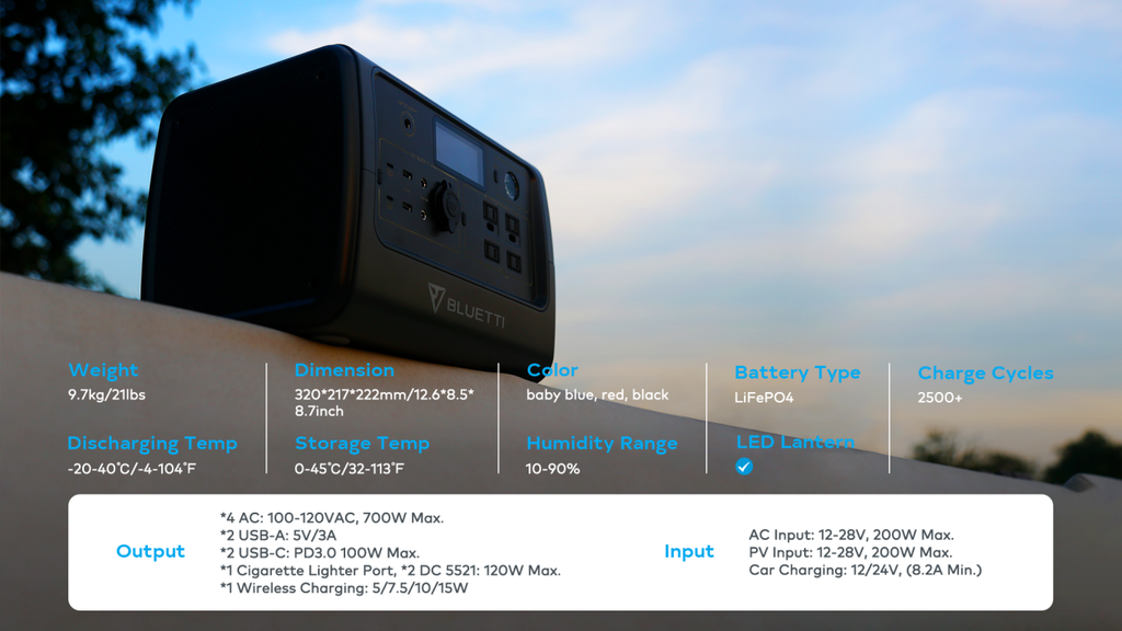 Bluetti EB70 можно заряжать от розетки или автомобильного аккумулятора. Зарядка от 0 до 80% займет до 2.9 часа. Также устройство можно заряжать с помощью солнечной панели, и процесс займет 4.5 часа.