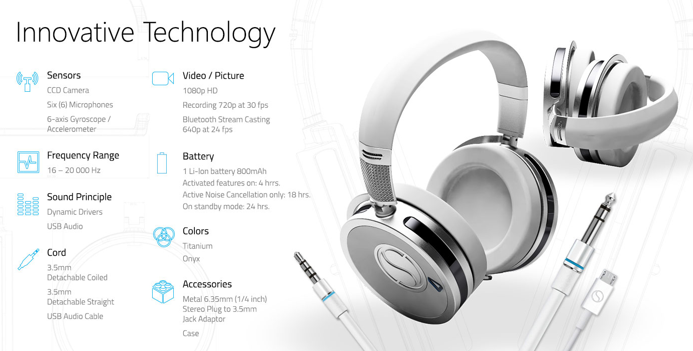 Новая модель, представленная стартапом SoundSight, претендует на звание самой высокотехнологичной. Беспроводные наушники оснащены двумя 5-мегапиксельными камерами с поддержкой записи HD-видео, шестью микрофонами, функцией голосового управления и гироскопом. С помощью SoundSight пользователь может не только снимать видео, но и осуществлять прямую трансляцию изображения на мобильные устройства.