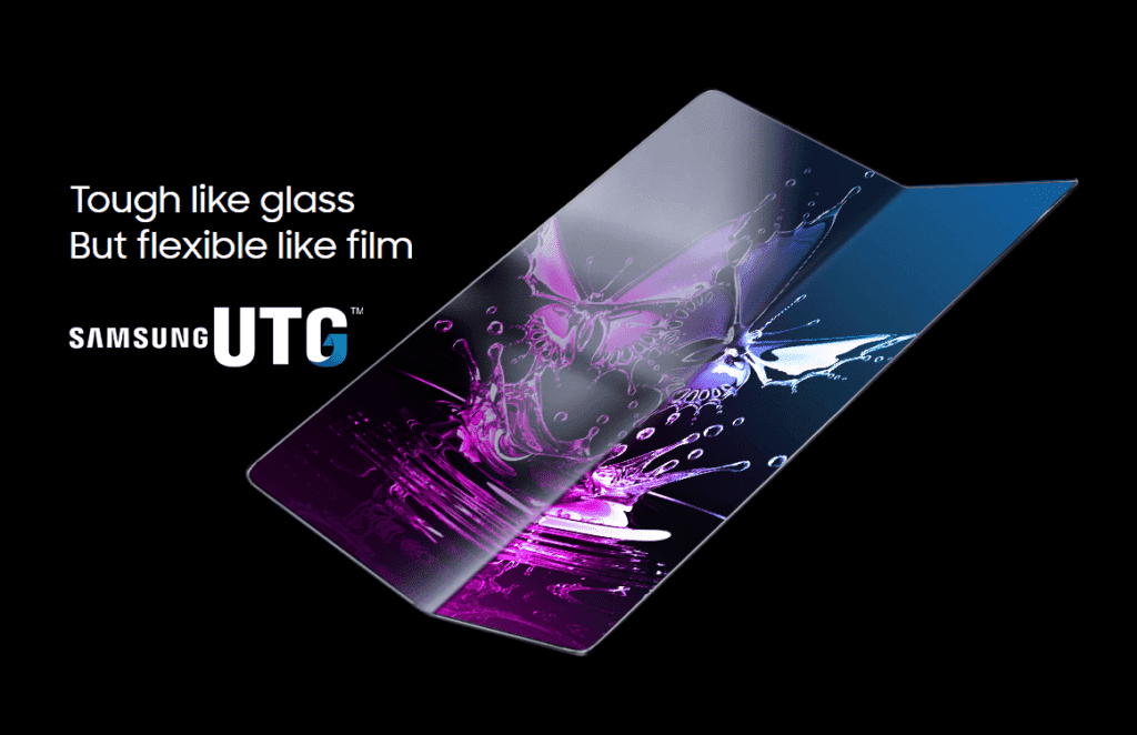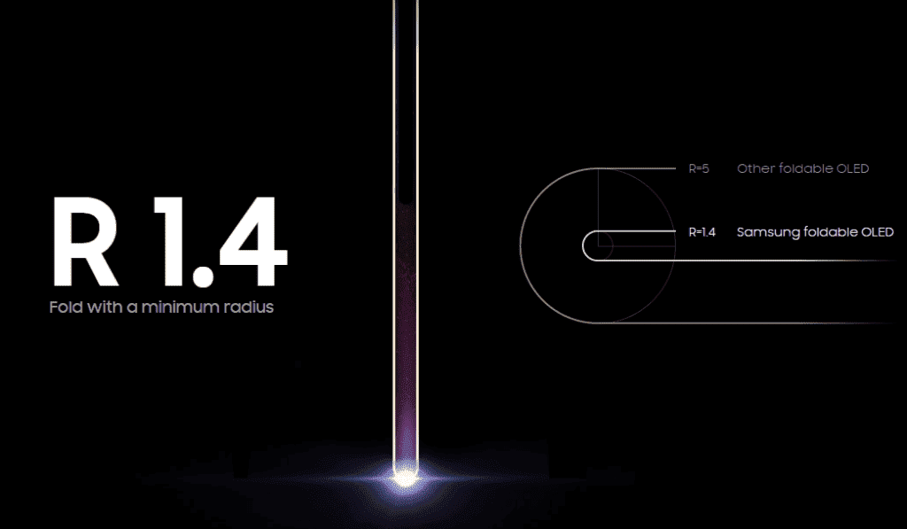 Новый гибкий OLED-экран Samsung покрыт ультратонким стеклом UTG, которое не имеет эффекта памяти и не формирует складки в месте сворачивания. Радиус складывания изобретения сократился до значения 1.4 мм.