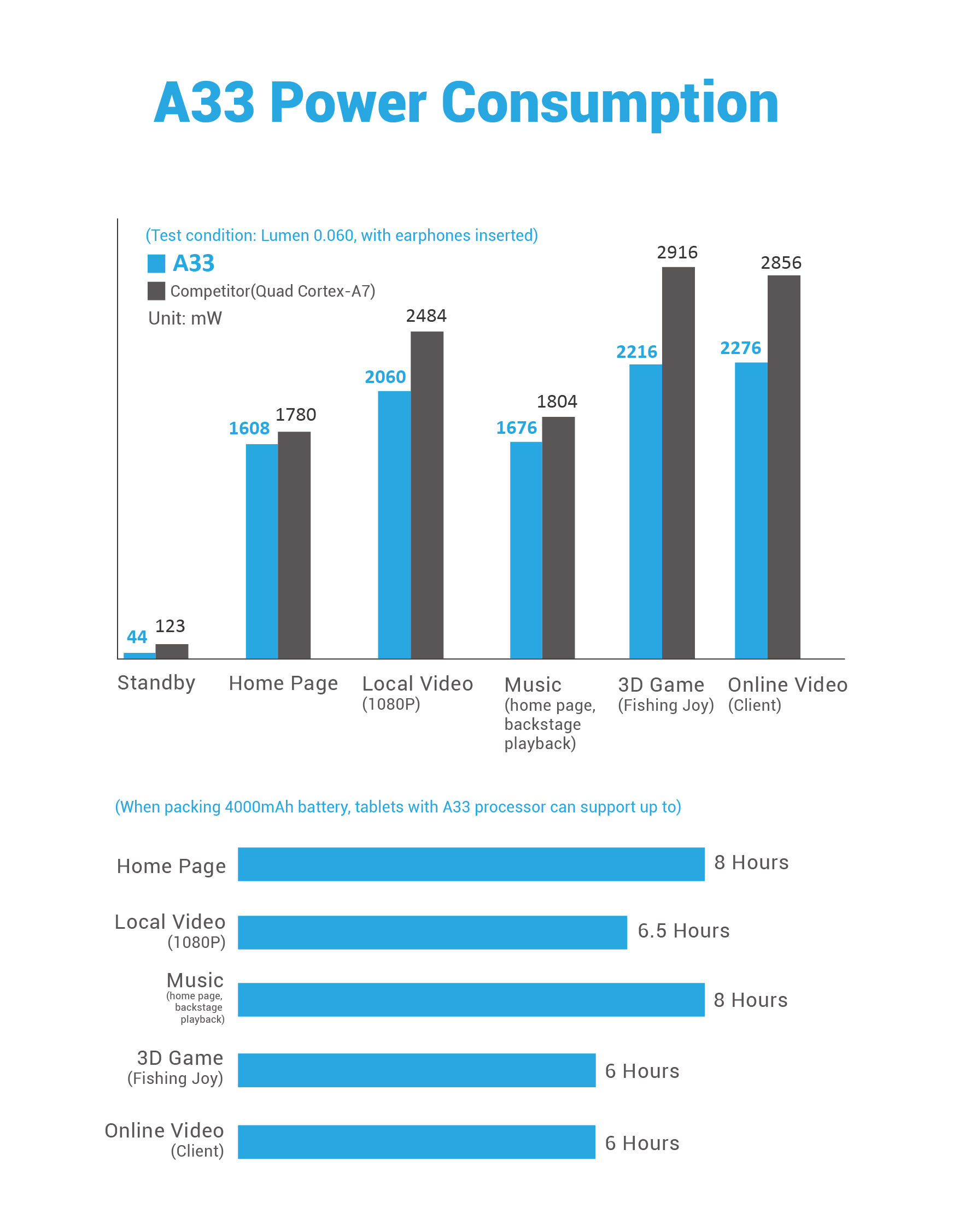 Allwinner A33 имеет четырехъядерный процессор Cortex-A7 и двухъядерный графический процессор Mali-400 MP2. Он поддерживает экраны с разрешением до 1280 х 800 пикселей и сможет воспроизводить видео 1080p @ 60fps. Он также интегрируется с технологией SmartColor, которая регулирует перенасыщение яркости на фотографиях и видео и славится «ультра-низким энергопотреблением».