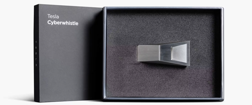 Cyberwhistle — это киберсвисток, дизайн которого вдохновлен пикапом Cybertruck. Представляя данный продукт, топ-менеджер сказал: «Не тратьте деньги на эту глупую салфетку Apple, купите лучше наш киберсвисток».
