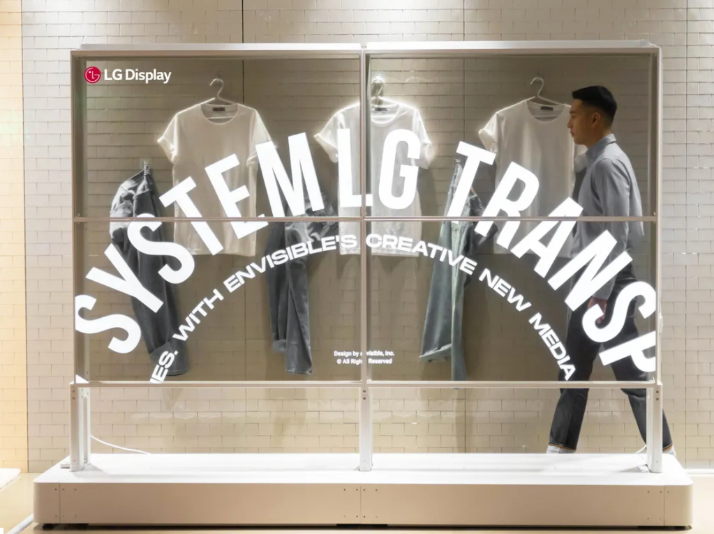 Также компания представила Shopping Managing Showcase — экран, предназначенный для люксовых магазинов. Прозрачный OLED-дисплей прикреплен к деревянной подставке. Он может создавать красивые эффекты при оформлении витрин.
