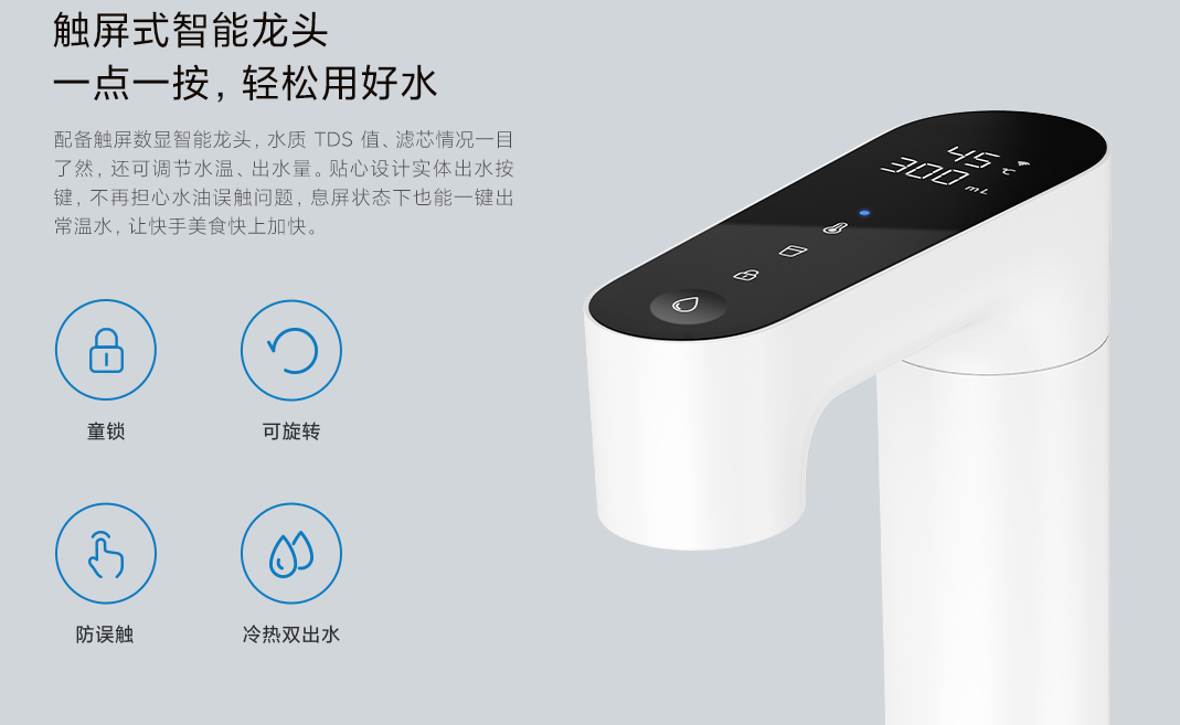 Mi Instant Water Purifier Q800 совместим с приложением Mijia. В наличии сенсорный дисплей, который встроен в верхнюю часть интеллектуального смесителя. На нем отображается значение качества воды, состояние фильтрующего элемента, позволяет регулировать температуру воды и производительность.