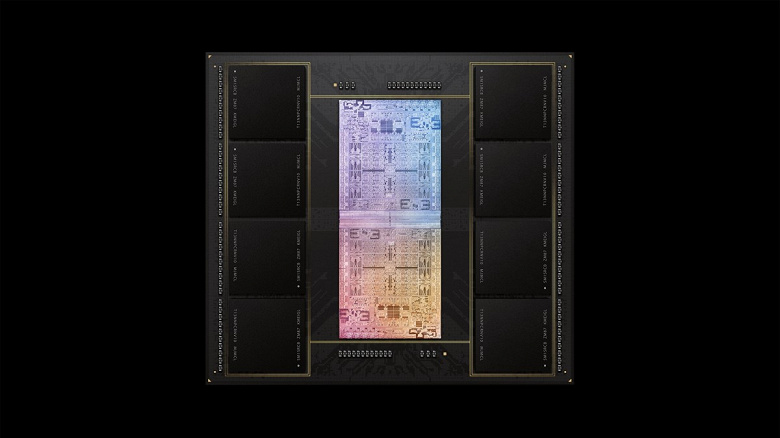 Топовый чип Apple M1 Ultra сочетает в себе два чипа M1 Max, соединенных вместе с новой архитектурой межсоединений, которую компания называет UltraFusion. При этом используется кремниевый промежуточный модуль, обеспечивающий пропускную способность 2.5 ТБ/с. Это снижает проблемы с задержкой и пропускной способностью по сравнению с двумя отдельными чипами, подключенными через материнскую плату.