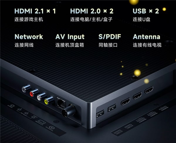 Что касается интерфейсов, телевизор имеет HDMI 2.1 порт, два порта HDMI 2.0, два порта USB, AV-вход, S/PDIF и сетевой кабель.
