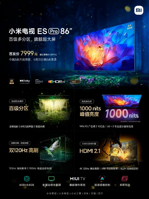 Стоимость Xiaomi TV ES Pro 86″ составляет 8 499 юаней (~ $1278). Он поступит в продажу в Китае с 31 мая.