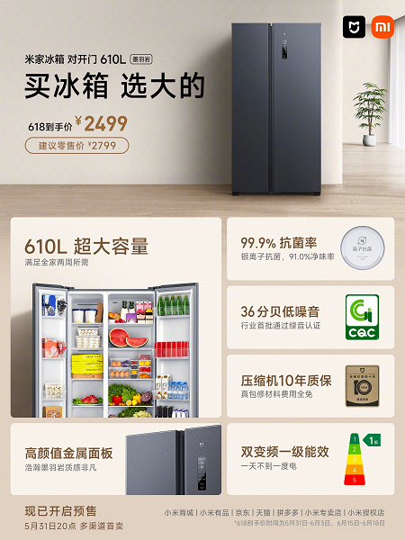 Оказалось, что в дополнение к смартфонам, наушникам и смарт-браслетам, техногигант представил в Китае новый доступный side-by-side-холодильник Xiaomi Mijia 610L.