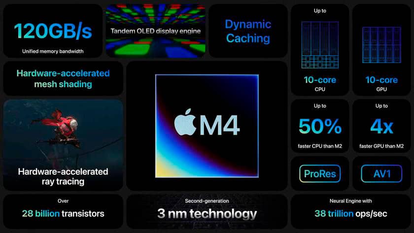 Apple M4 оснащен самым быстрым нейронным движком Neural Engine, способным выполнять до 38 триллионов операций в секунду, что, по словам Apple, «быстрее, чем нейронный процессор любого ПК с искусственным интеллектом сегодня».