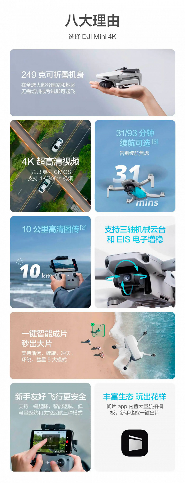DJI Mini 4K уже поступил в продажу в Китае по цене, эквивалентной $200. По словам производителя, новинка представляет собой первый мини-дрон для аэрофотосъемки в формате 4K по настолько низкой стоимости.