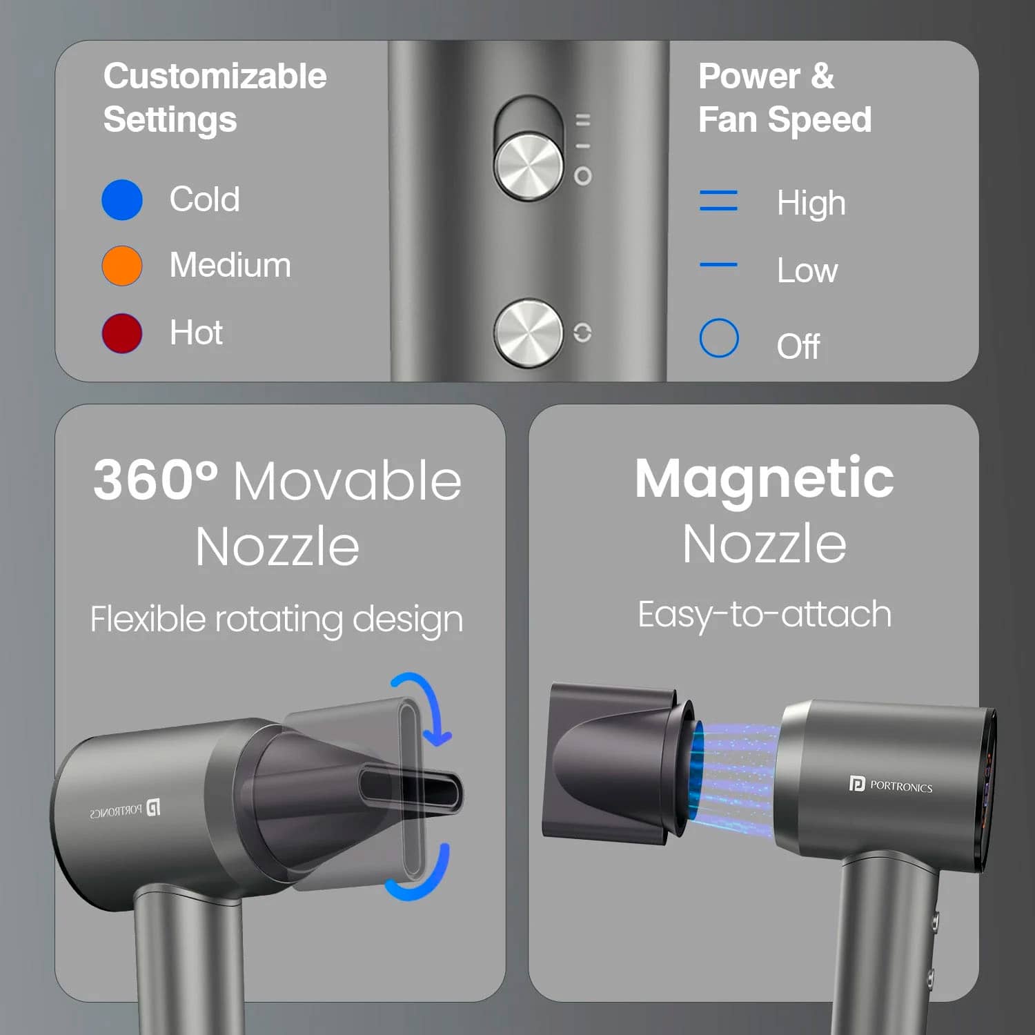Устройство оборудовано многофункциональной магнитной насадкой, которая упрощает процесс укладки. Насадка легко крепится и снимается, обеспечивая лучший контроль над направлением воздушного потока. Кроме того, фен имеет легкий и портативный дизайн.