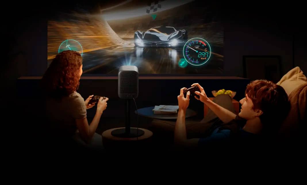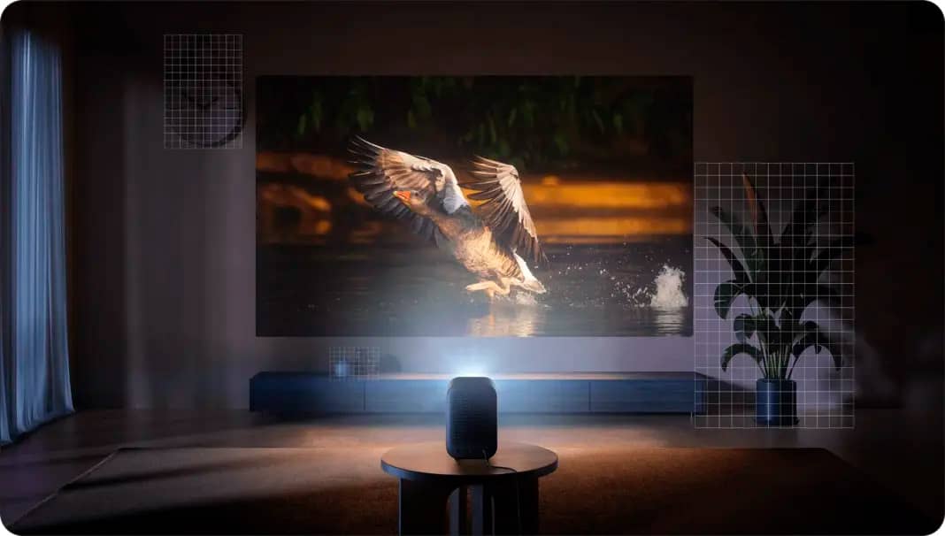 Размер проецируемого экрана варьируется от 40 до 120 дюймов, при этом оптимальным считается диапазон от 60 до 100 дюймов. Благодаря коэффициенту проекции 1.2:1, проектор легко вписывается в большинство помещений. Устройство обеспечивает яркость до 200 ISO люмен, сертифицированную компанией SGS. Автофокусировка и автоматическая коррекция трапецеидальных искажений (до ±15°) позволяют сохранить четкость и правильное выравнивание изображения даже при смещении или наклоне проектора. Также реализованы функции автоматического обхода препятствий и подстройки изображения к экрану с помощью встроенного ИИ.