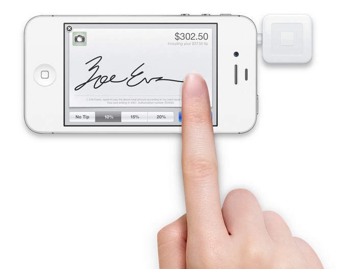 Само устройство Square непосредственно контактирует с кредиткой, а PIN-код и подпись владельца карточки вводятся через сенсорный экран смартфона.