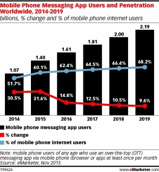 По оценкам аналитической компании eMarketer, прирост по сравнению с прошлым годом ожидается большой — 31,6%. В будущем эксперты ожидают существенного падения темпов роста аудитории, но их будет становиться все больше — уже в 2018 году количество пользователей служб мгновенного обмена сообщениями достигнет двух миллиардов, или 80% пользователей смартфонов.