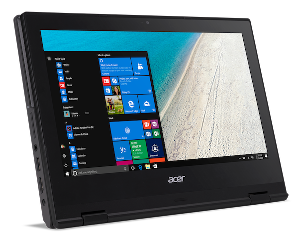 Acer TravelMate Spin B1 обладает 11.6-дюймовым, устойчивым к давлению экраном, способным поворачиваться на 360 градусов, очень прочным корпусом и клавиатурой, защищенной от проникновения влаги.