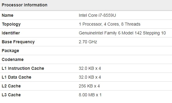 Устройство зарегистрировано в бенчмарке под именем MacBook Pro15.2. Судя по всему, его сердцем станет аппаратная платформа Intel Coffee Lake в виде 14-нм 4-ядерного процессора Core i7-8559U, тактовая частота которого варьируется от 2.7 ГГц до 4.5 ГГц.
