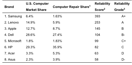 В этот раз список самых надежных компьютеров возглавила компания Samsung. Она занимает 6.4% рынка компьютеров США, но на ее долю приходится только 1.63% случаев ремонта. Рейтинг надежности ее устройств составляет 393 балла, а уровень — А+.