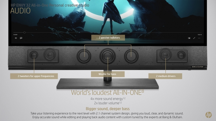 В HP также уверяют, что их моноблок оказался самым громким на рынке. Устройство имеет качественные фронтальные динамики и сабвуфер, оптимизированные Bang & Olufsen. Поддерживается функция Advanced Audio Stream и есть возможность вывести звук со смартфона на моноблок, даже когда последний выключен.