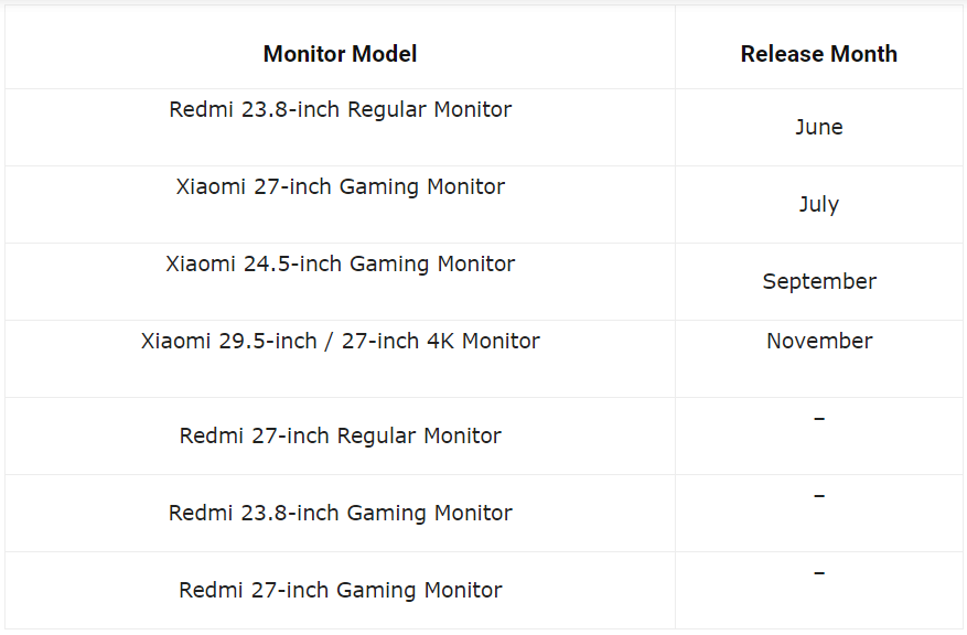 Что касается материнской компании Xiaomi, то она планирует в июле выпустить 27-дюймовый игровой монитор, в сентябре — игровой 24.5-дюймовый монитор, в ноябре — игровые 27- и 29.5-дюймовые мониторы.