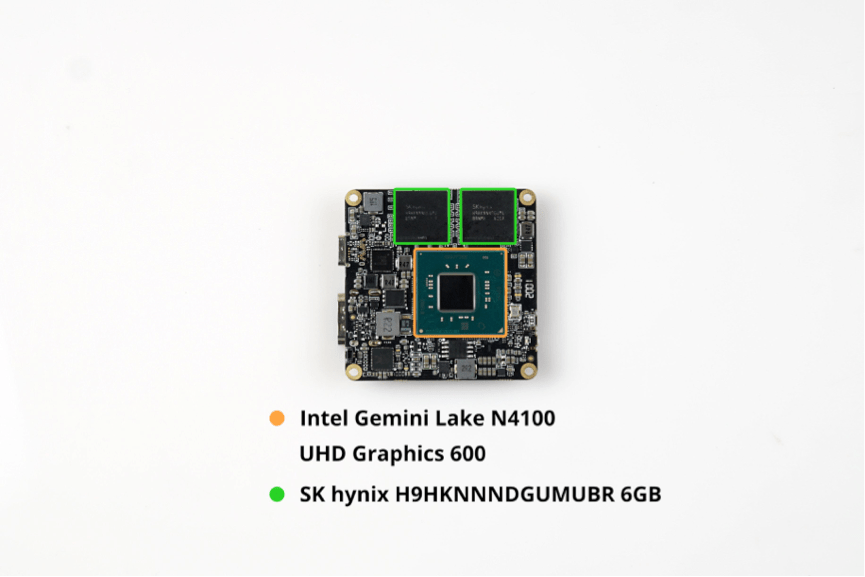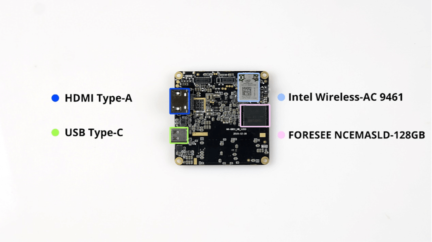 Вслед за этим можно увидеть другую плату, которая подключена к вышеупомянутой материнской плате через кабель. Эта небольшая и компактная плата содержит основные компоненты LarkBox и другие интерфейсы: процессор, память, накопитель, беспроводной модуль, интерфейсы USB-C и HDMI.